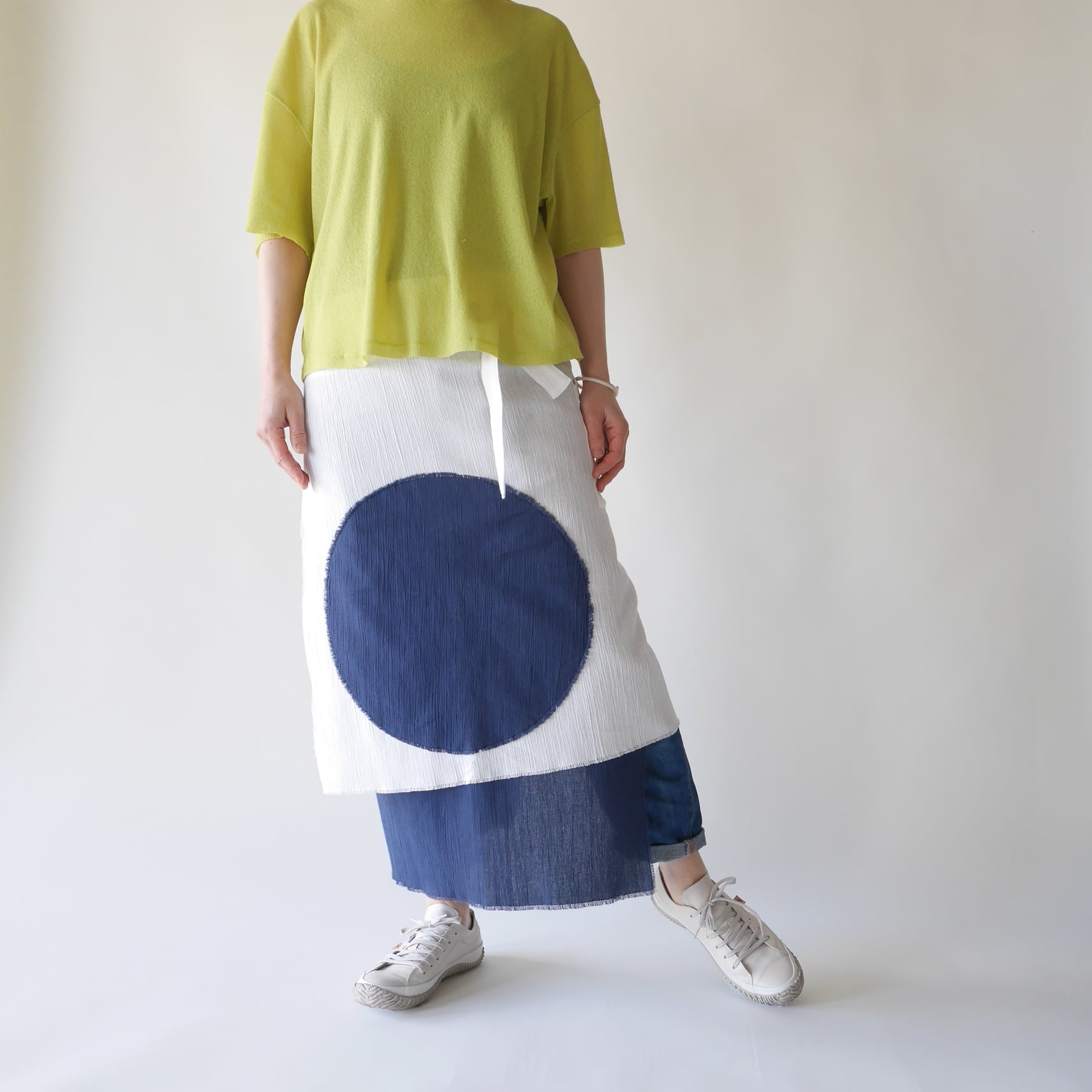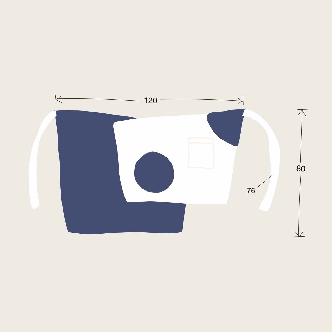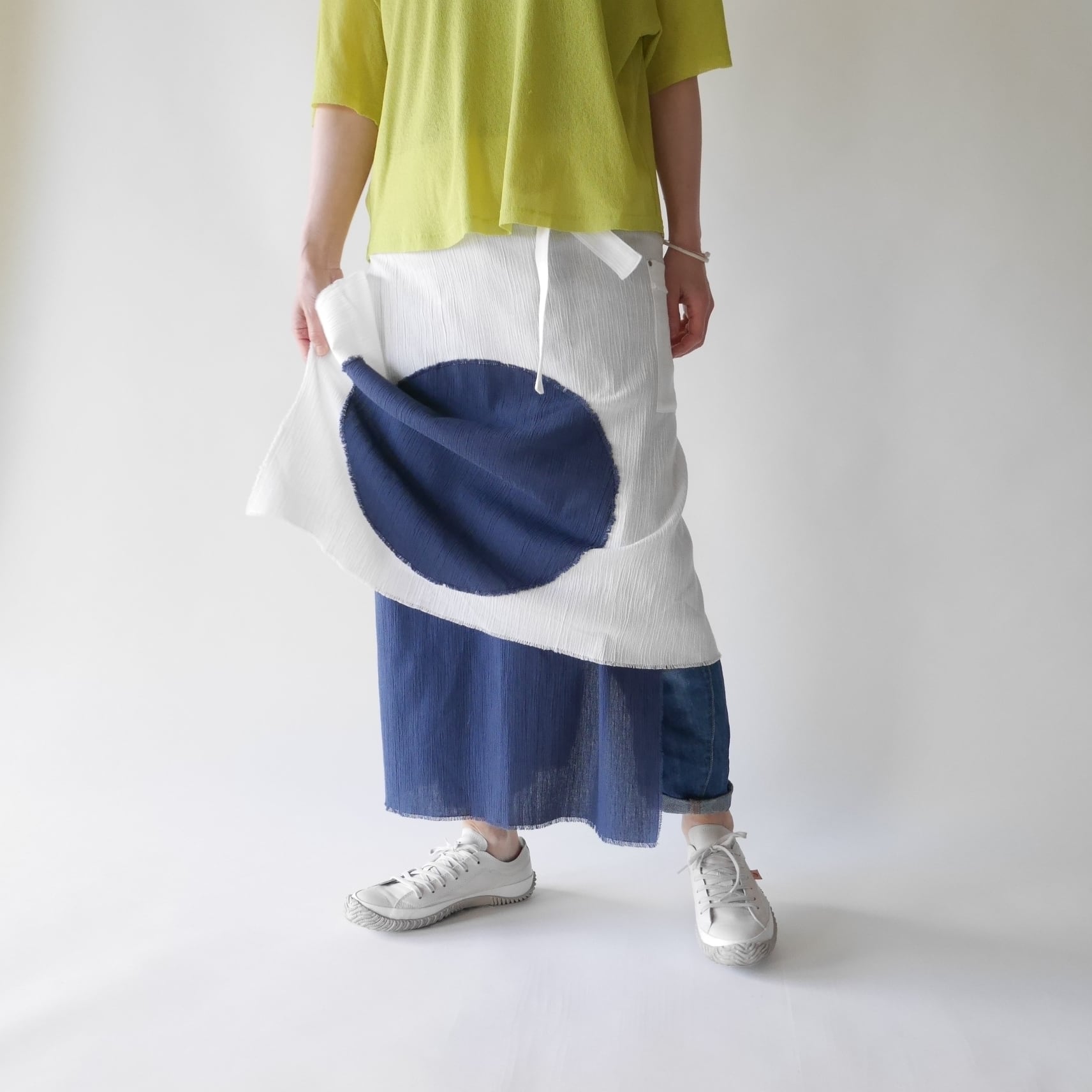 白い生地にネイビーの水玉が印象的なまえかけです。