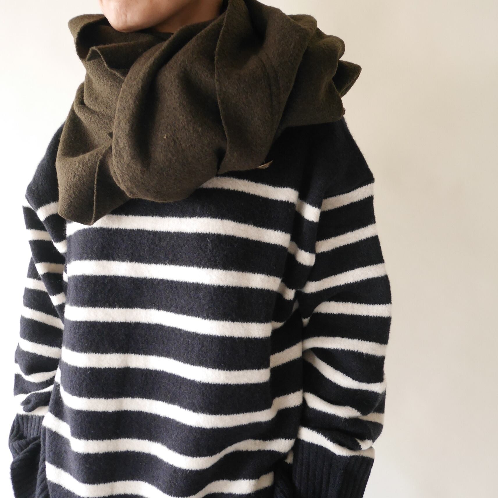 ショールを無造作に首にかけて、片側の端をもう片側の穴に通すと